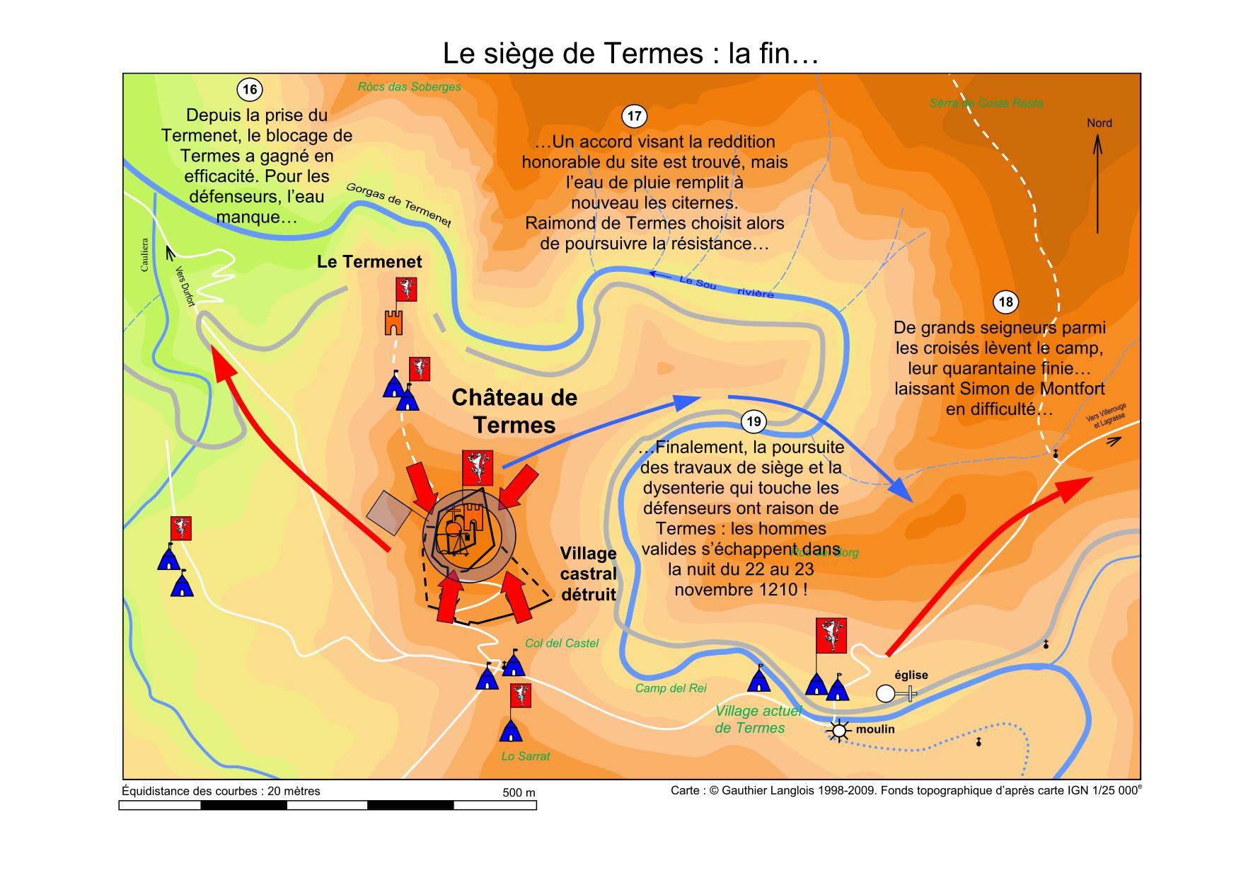 Les défenseurs de Termes, touchés par la dysenterie, choisissent la fuite. Les croisés alertés en interceptent un certain nombre. Les femmes, enfants, vieillards et blessés sont laissés dans le château. Il ne leur est pas fait de mal. Il semble qu'il n'y ait pas eu de bûcher d'hérétiques : ceux qui étaient présents ont apparemment pu s’échapper.