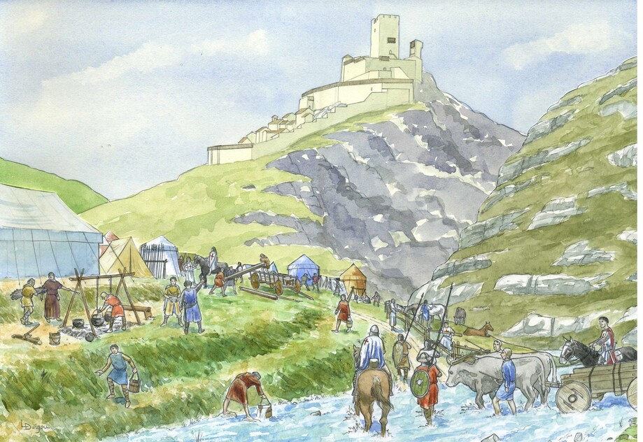 Raimond of Termes has stocked up on supplies and materials for war. He has mobilised his loyal vassals, recruited mercenaries, and war machines have been made by a specialist. Allied lords are here as a reinforcement in this crucial battle. There are maybe 500 people in total of which 250 are fighting men. With its steep slopes on three sides forming a natural defence it seems a place ready for confrontation.