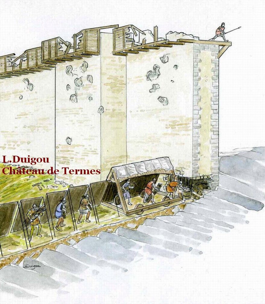 pierrières et mangonneaux qui sont actionnés face au rempart du