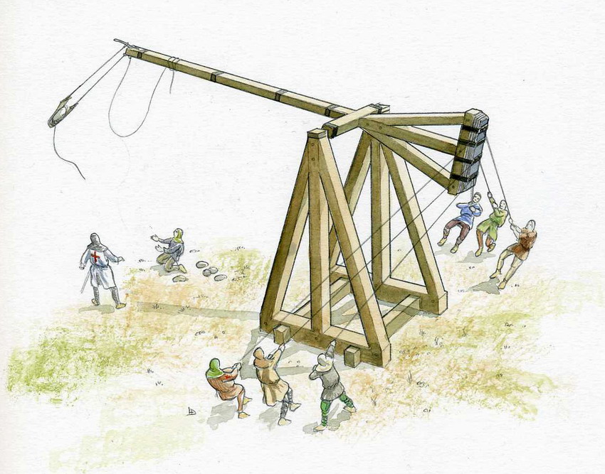 à ce que l'on voit dans de nombreuses reconstitutions, la catapulte -engin antique- n'est plus utilisée en Europe au Moyen Age : elle est