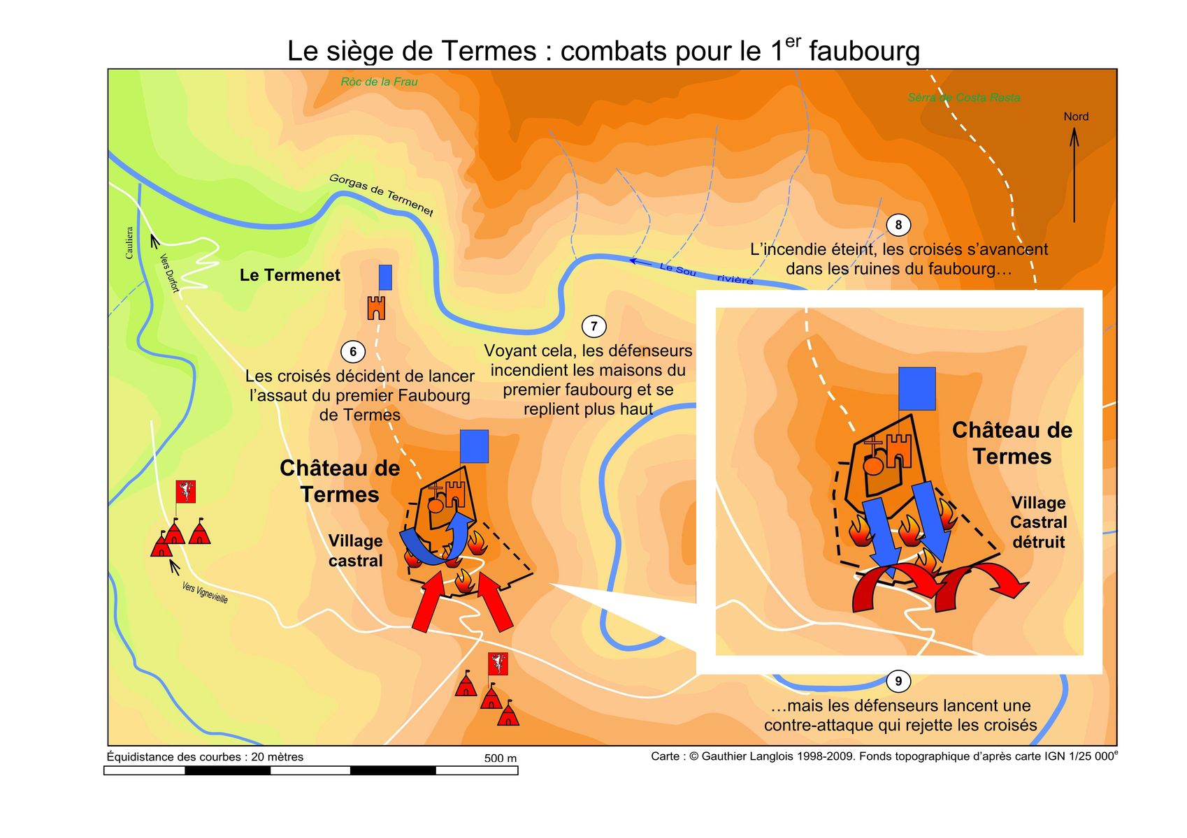 Le second niveau de rempart qui se dresse devant les croisés résiste ensuite aux offensives : dès qu’une brèche se forme, elle est comblée ou doublée par un nouveau mur érigé par les défenseurs. Après plusieurs semaines, bloqué au Sud, Simon de Montfort s’intéresse au secteur Nord du site, là où se dresse le fortin du Termenet.