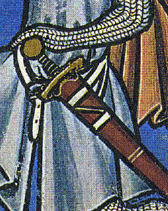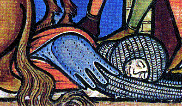 Soldat couché au sol portant une cotte de maille ainsi qu’une capuche, le camail, protection métallique souple recouvrant le cou et les épaules. Il porte également un gambison (ou jaque) par dessus, sorte de vêtement matelassé, ou multicouche, destiné à servir de protection lors d’un combat.