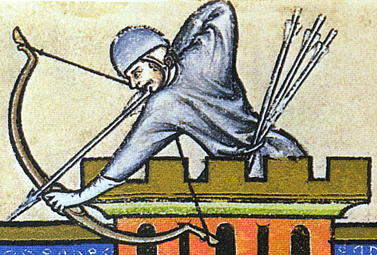 Pour leur sécurité et leur survie, les assaillants, archers ou arbalétriers, pratiquent leur approche sous le couvert de mantelets, sortes de petites palissades de bois.